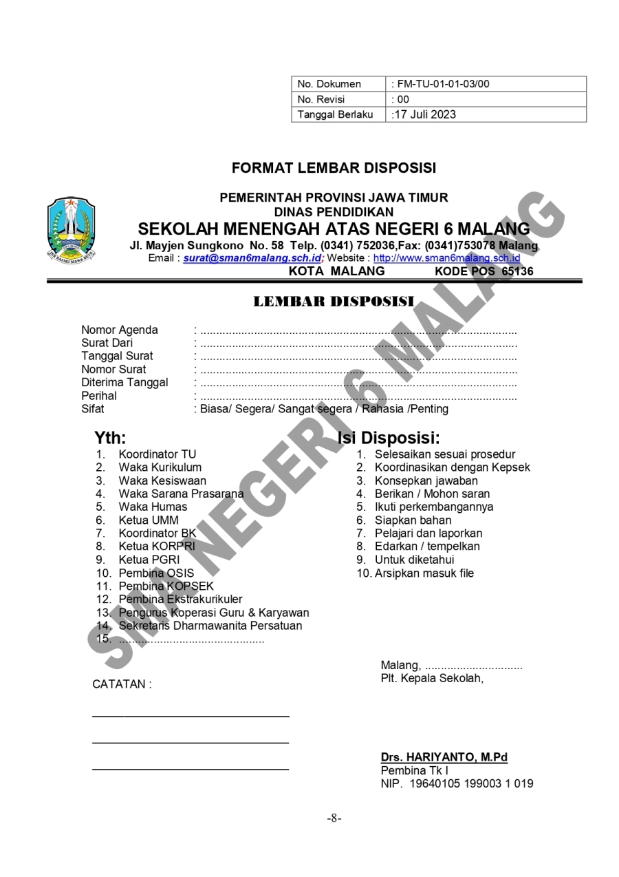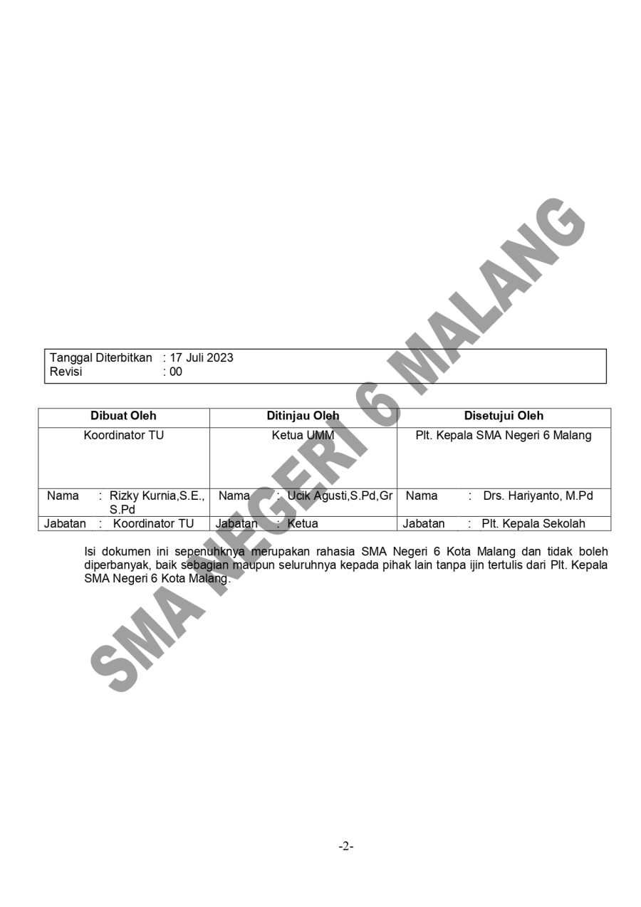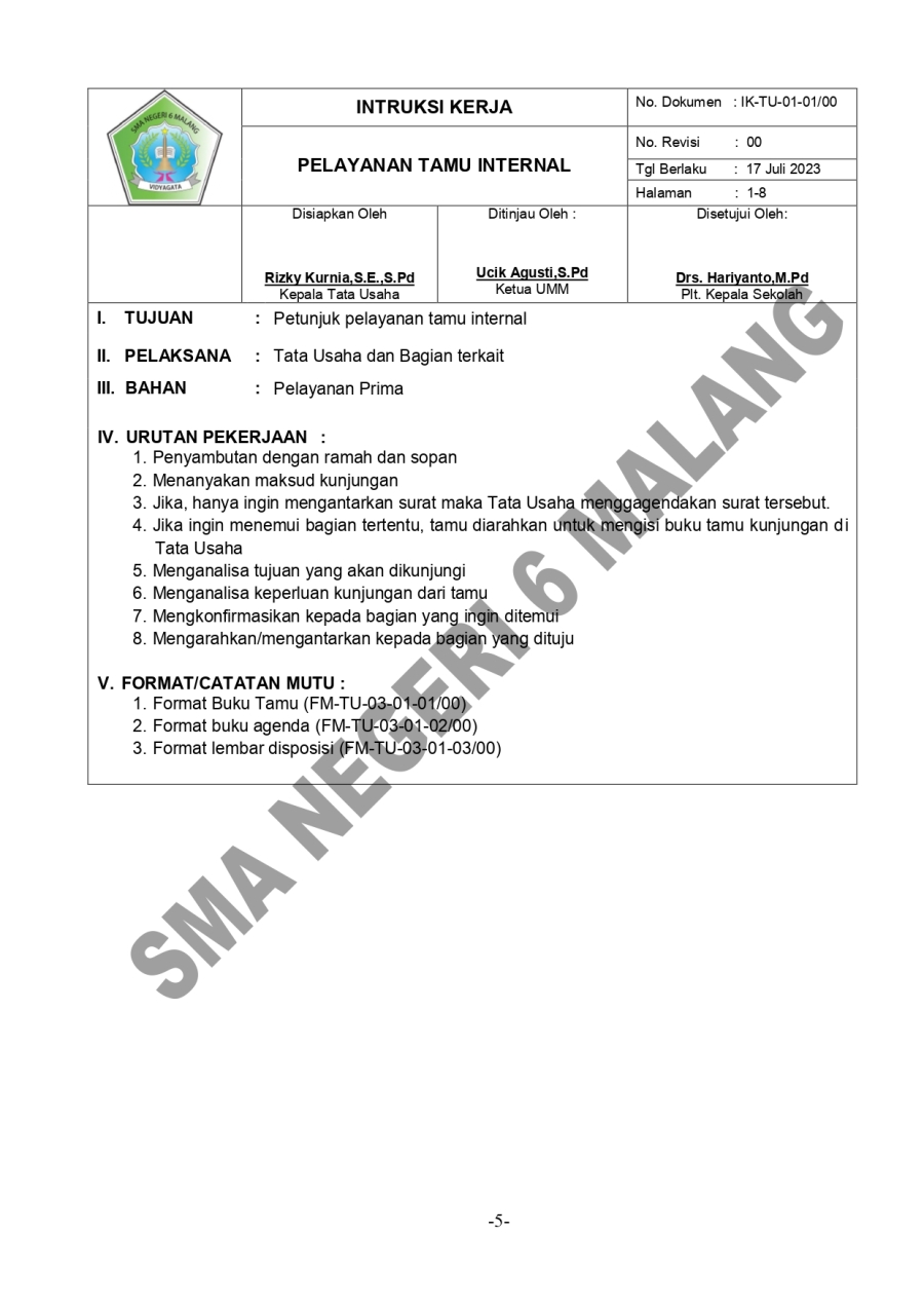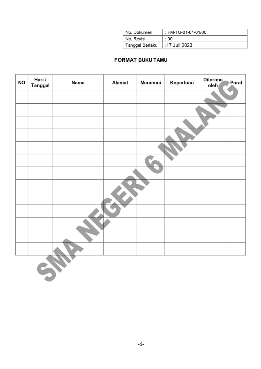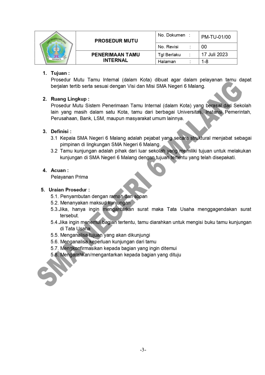 PROSEDUR MUTU PENERIMAAN TAMU INTERNAL SMA 6 15 Oktober 20230 Comments1541 PembacaBagikan : Previous postNext post KomentarSearchCategoryBeasiswa ADEM3Info Beasiswa1Informasi16Karir0Kegiatan Peserta Didik2Kewirausahaan2Pengalaman siswa2Pengumuman0Prestasi1Program Sekolah0Sains dan Teknologi0Tips Belajar1Blog Terbaru 19 Mei 2025SELAMAT ULANG TAHUN IBU KHOFIFAH INDAR PARAWANSA 25 Maret 2025PRESTASI PESERTA DIDIK SMA NEGERI 6 KOTA MALANG LOLOS J.. 19 Maret 2025INFORMASI SPMB 2025 13 Maret 2025PESANTREN RAMADHAN SMA NEGERI 6 KOTA MALANG 05 Februari 2025PAMERAN KOLABORASI SENI BUDAYA DAN PKWUPopulerPAMERAN KOLABORASI SENI BUDAYA DAN PKWU 05 Februari 2025CERITAKU SEBAGAI SISWA REPATRIASI DI SMA NEGERI 6 MALAN.. 14 Oktober 2023KELAS BAHASA JEPANG : PRAKTIK MEMASAK MAKANAN JEPANG 02 Februari 2024Tips Memilih Bimbingan Belajar (Bimbel) Paling Tepat un.. 19 November 2020SEMARAK 44 TAHUN SMARIHEKSA 01 Agustus 2024DownloadPanduan sistem 177.49 KB 22584 DownloadTagsRIsekolah#SMARIHEKSA #SMANEGERI6MALANG #SSD11 #SMARIHEKSASABADESA #PAsman6beasiswaInformasiADEMkurikulum