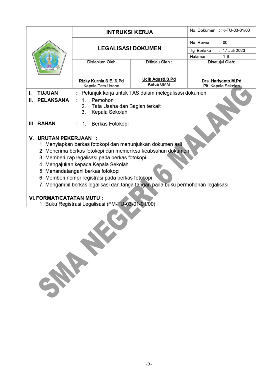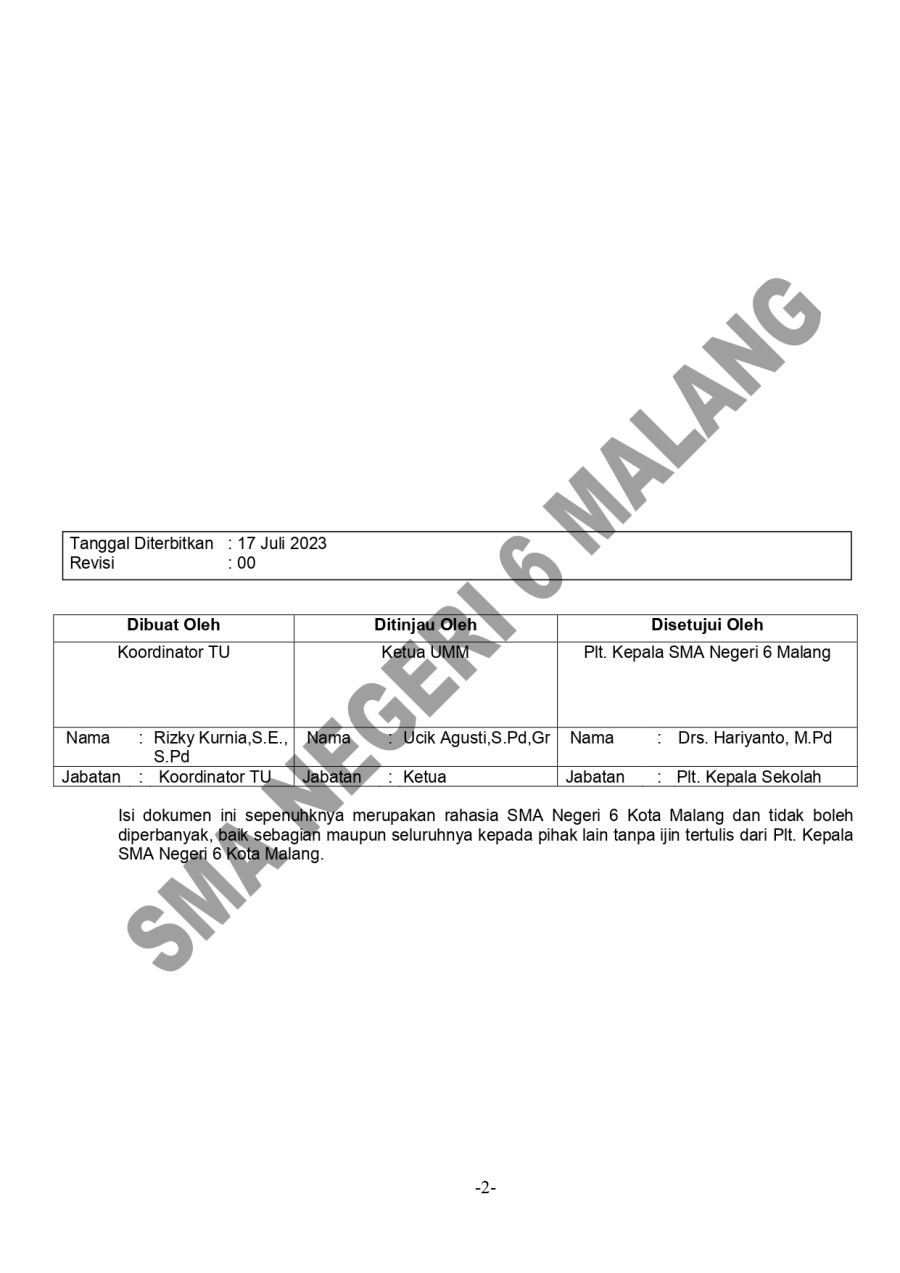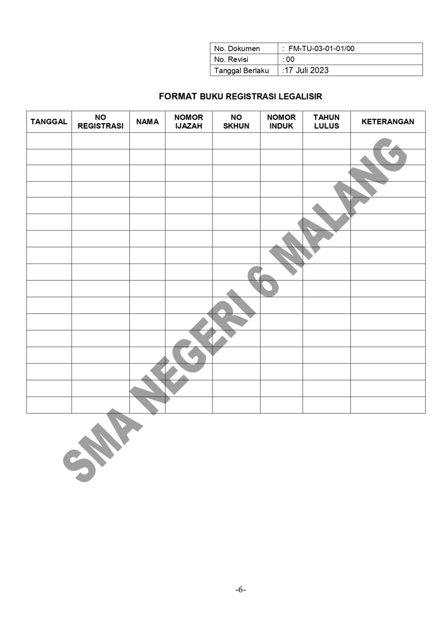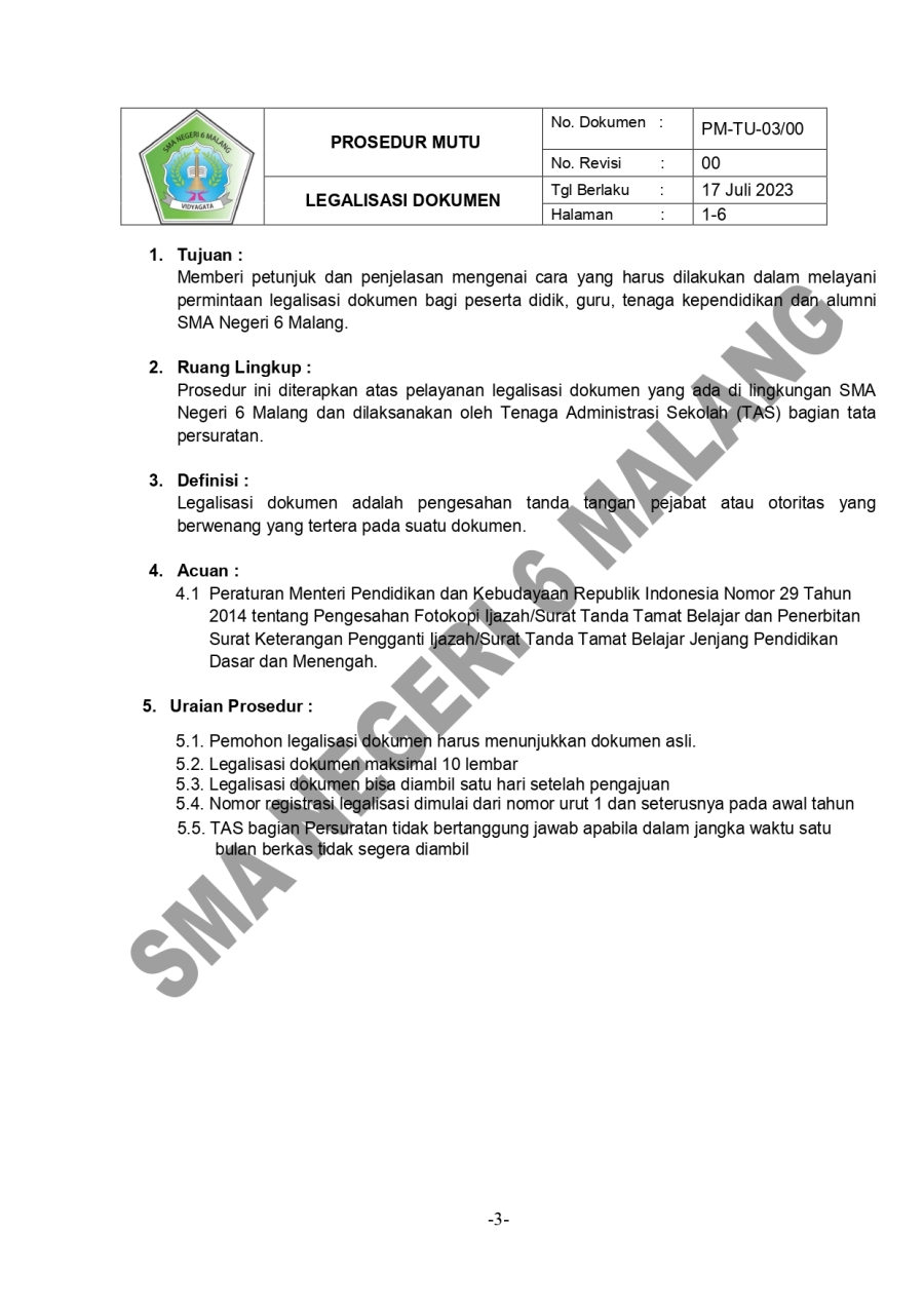 PROSEDUR MUTU LEGALISASI DOKUMEN SMA 6 15 Oktober 20230 Comments1487 PembacaBagikan : Previous postNext post KomentarSearchCategoryBeasiswa ADEM3Info Beasiswa1Informasi16Karir0Kegiatan Peserta Didik2Kewirausahaan2Pengalaman siswa2Pengumuman0Prestasi1Program Sekolah0Sains dan Teknologi0Tips Belajar1Blog Terbaru 19 Mei 2025SELAMAT ULANG TAHUN IBU KHOFIFAH INDAR PARAWANSA 25 Maret 2025PRESTASI PESERTA DIDIK SMA NEGERI 6 KOTA MALANG LOLOS J.. 19 Maret 2025INFORMASI SPMB 2025 13 Maret 2025PESANTREN RAMADHAN SMA NEGERI 6 KOTA MALANG 05 Februari 2025PAMERAN KOLABORASI SENI BUDAYA DAN PKWUPopulerSEMARAK 44 TAHUN SMARIHEKSA 01 Agustus 2024Kembali Dibuka! Beasiswa Unggulan Kemdikbud untuk Mahas.. 19 November 2020KESEMPATAN MERAIH BEASISWA YANG TIDAK AKAN AKU SIA-SIAK.. 14 Oktober 20234 Tips Agar Kegiatan Belajar di Rumah Tidak Membosankan 19 November 2020INFORMASI SPMB 2025 19 Maret 2025DownloadPanduan sistem 177.49 KB 22585 DownloadTagskurikulum#SMARIHEKSA#SMARIHEKSA #SMANEGERI6MALANG #SSD11 #SMARIHEKSASABADESA #PAmalangsiswa barusiswa barusman6Karir