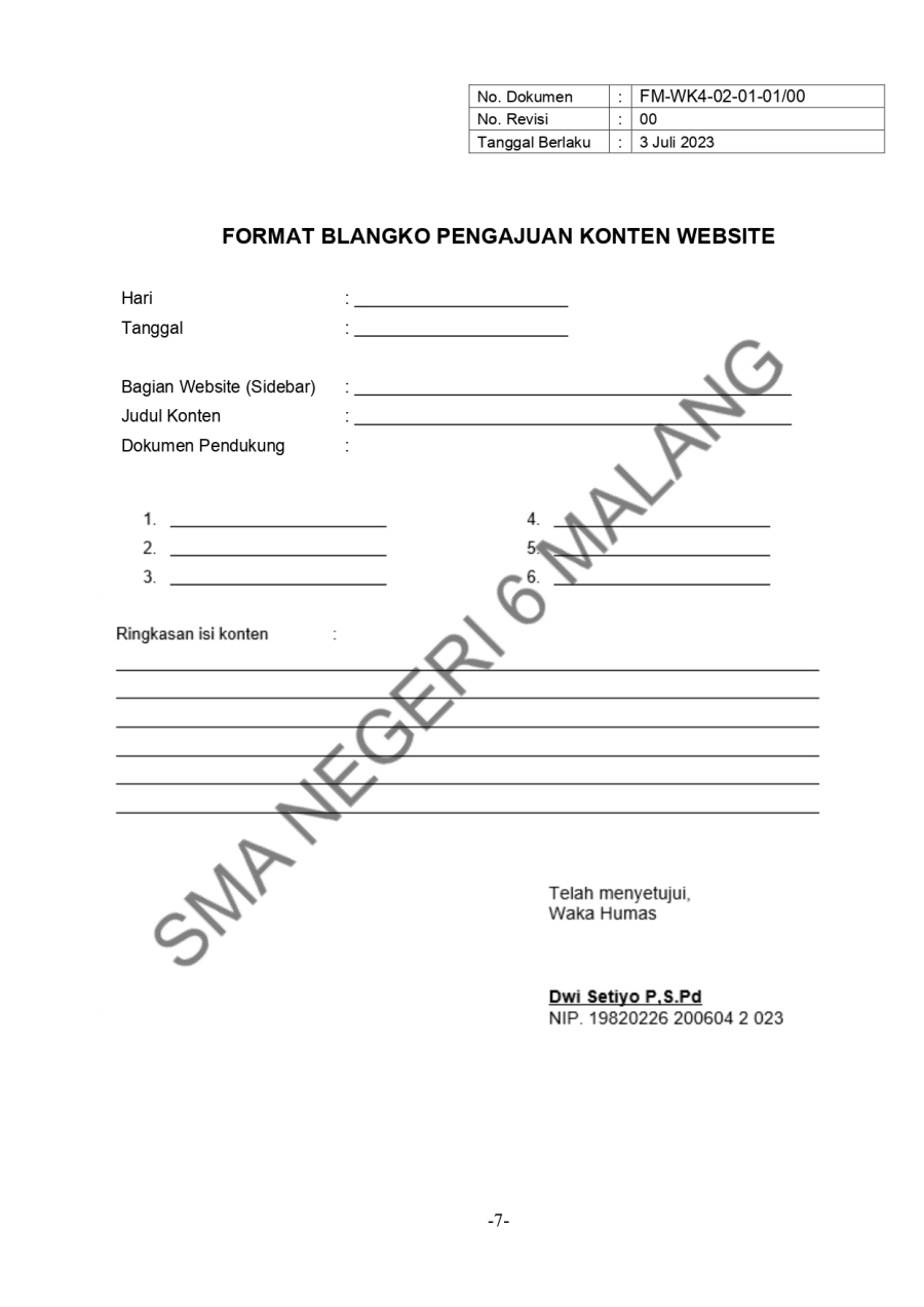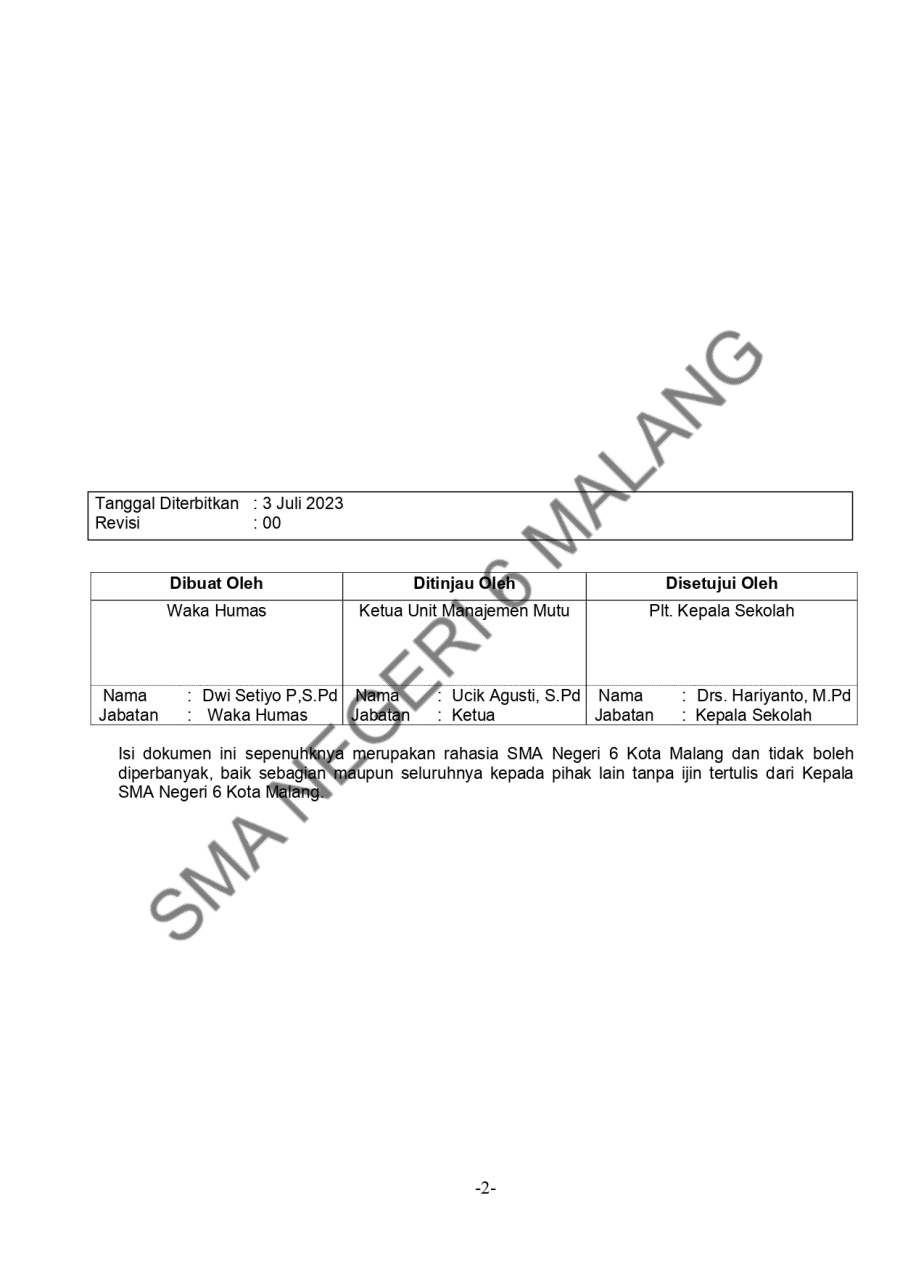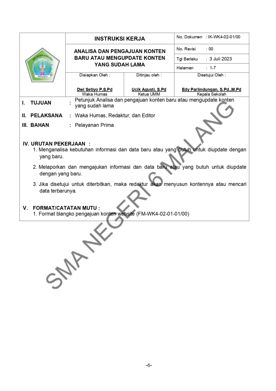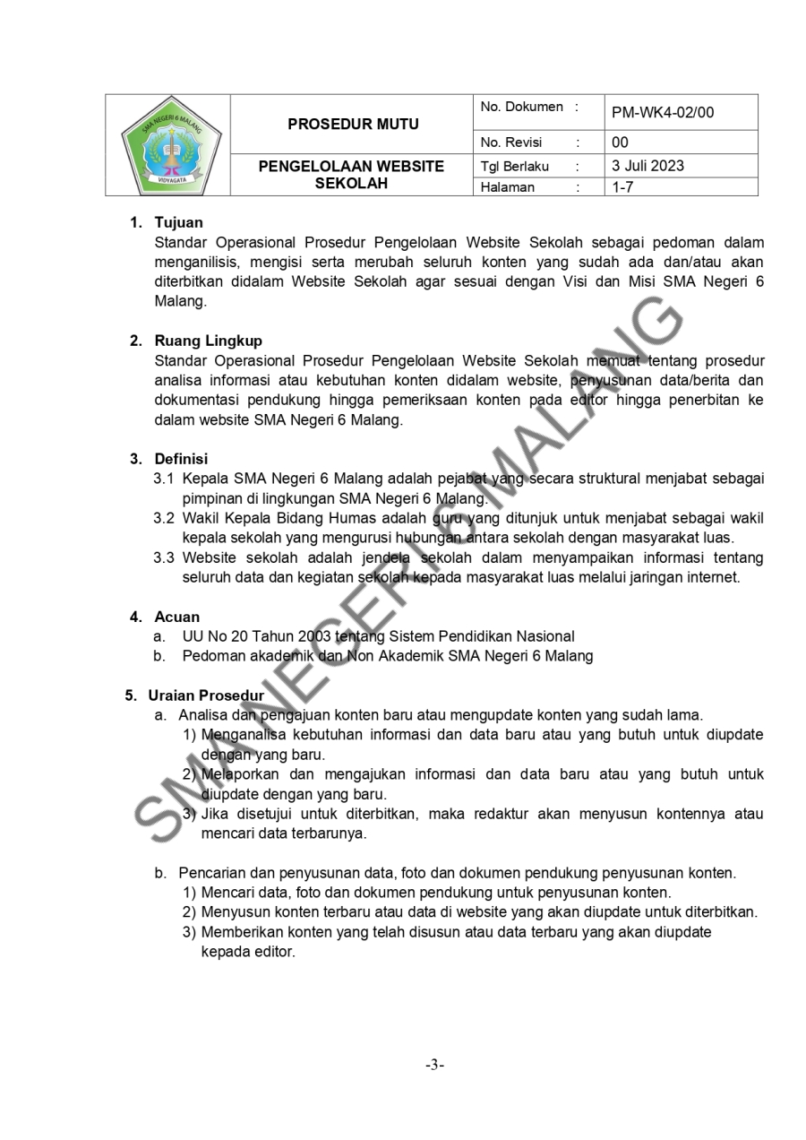 PROSEDUR MUTU - PENGELOLAAN WEBSITE SEKOLAH TAHUN PELAJARAN 2023/2024 Admin SMAN6MLG 16 Oktober 20230 Comments1564 Pembaca Bagikan : Previous postNext post KomentarSearchCategoryBeasiswa ADEM3Info Beasiswa1Informasi16Karir0Kegiatan Peserta Didik2Kewirausahaan2Pengalaman siswa2Pengumuman0Prestasi1Program Sekolah0Sains dan Teknologi0Tips Belajar1Blog Terbaru 19 Mei 2025SELAMAT ULANG TAHUN IBU KHOFIFAH INDAR PARAWANSA 25 Maret 2025PRESTASI PESERTA DIDIK SMA NEGERI 6 KOTA MALANG LOLOS J.. 19 Maret 2025INFORMASI SPMB 2025 13 Maret 2025PESANTREN RAMADHAN SMA NEGERI 6 KOTA MALANG 05 Februari 2025PAMERAN KOLABORASI SENI BUDAYA DAN PKWUPopulerINFORMASI SPMB 2025 19 Maret 2025MEMAKNAI PERINGATAN HARI KARTINI 2024 22 April 2024Tips Memilih Bimbingan Belajar (Bimbel) Paling Tepat un.. 19 November 2020Jurusan Sastra Indonesia: Materi Kuliah dan Peluang Ker.. 19 November 2020SEMARAK 44 TAHUN SMARIHEKSA 01 Agustus 2024DownloadPanduan sistem 177.49 KB 22589 DownloadTagshutppdbprogram#SMARIHEKSA #SMANEGERI6MALANG #SSD11 #SMARIHEKSASABADESA #PAbeasiswasman6#sainssmariheksa
