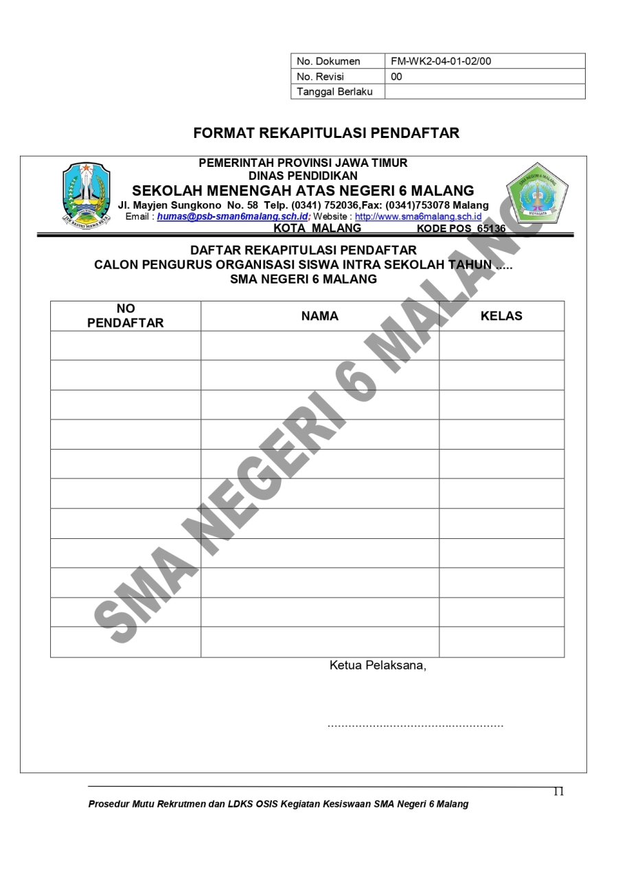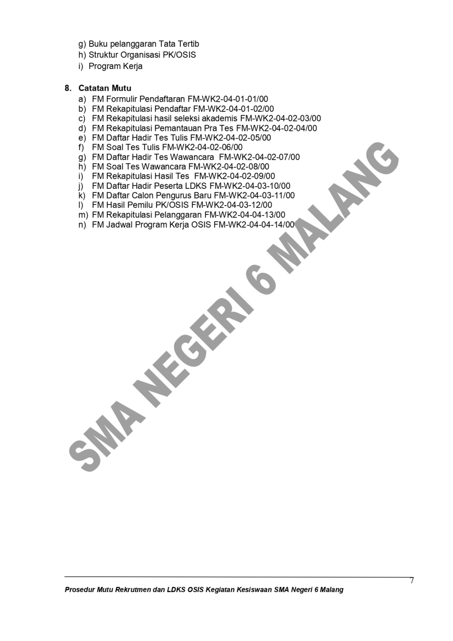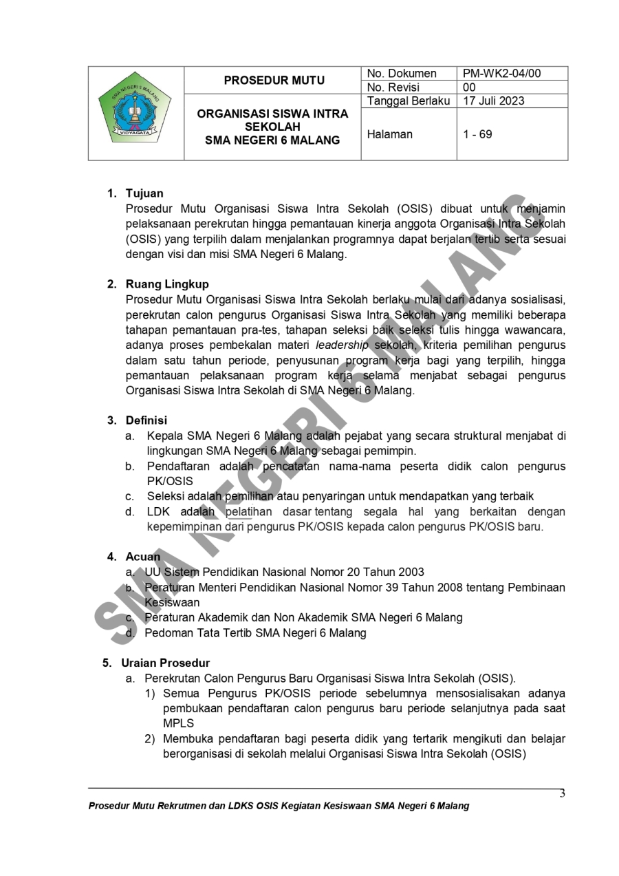 PROSEDUR MUTU - PEREKRUTAN, LDK, OSIS TAHUN PELAJARAN 2023/2024 Admin SMAN6MLG 16 Oktober 20230 Comments1905 Pembaca Bagikan : Previous postNext post KomentarSearchCategoryBeasiswa ADEM3Info Beasiswa1Informasi16Karir0Kegiatan Peserta Didik2Kewirausahaan2Pengalaman siswa2Pengumuman0Prestasi1Program Sekolah0Sains dan Teknologi0Tips Belajar1Blog Terbaru 19 Mei 2025SELAMAT ULANG TAHUN IBU KHOFIFAH INDAR PARAWANSA 25 Maret 2025PRESTASI PESERTA DIDIK SMA NEGERI 6 KOTA MALANG LOLOS J.. 19 Maret 2025INFORMASI SPMB 2025 13 Maret 2025PESANTREN RAMADHAN SMA NEGERI 6 KOTA MALANG 05 Februari 2025PAMERAN KOLABORASI SENI BUDAYA DAN PKWUPopulerJARI TINTA PEMULA 16 Februari 2024KELAS BAHASA JEPANG : PRAKTIK MEMASAK MAKANAN JEPANG 02 Februari 2024HEROES #3 PUNCAK ACARA HUT SMA NEGERI 6 MALANG 26 Agustus 2024SELEKSI NASIONAL BERDASARKAN PRESTASI (SNBP) 2024 26 Maret 2024KESEMPATAN MERAIH BEASISWA YANG TIDAK AKAN AKU SIA-SIAK.. 14 Oktober 2023DownloadPanduan sistem 177.49 KB 22592 DownloadTags#SMARIHEKSA#SMARIHEKSAsmariheksahutke78KarirADEMsman6kurikulum