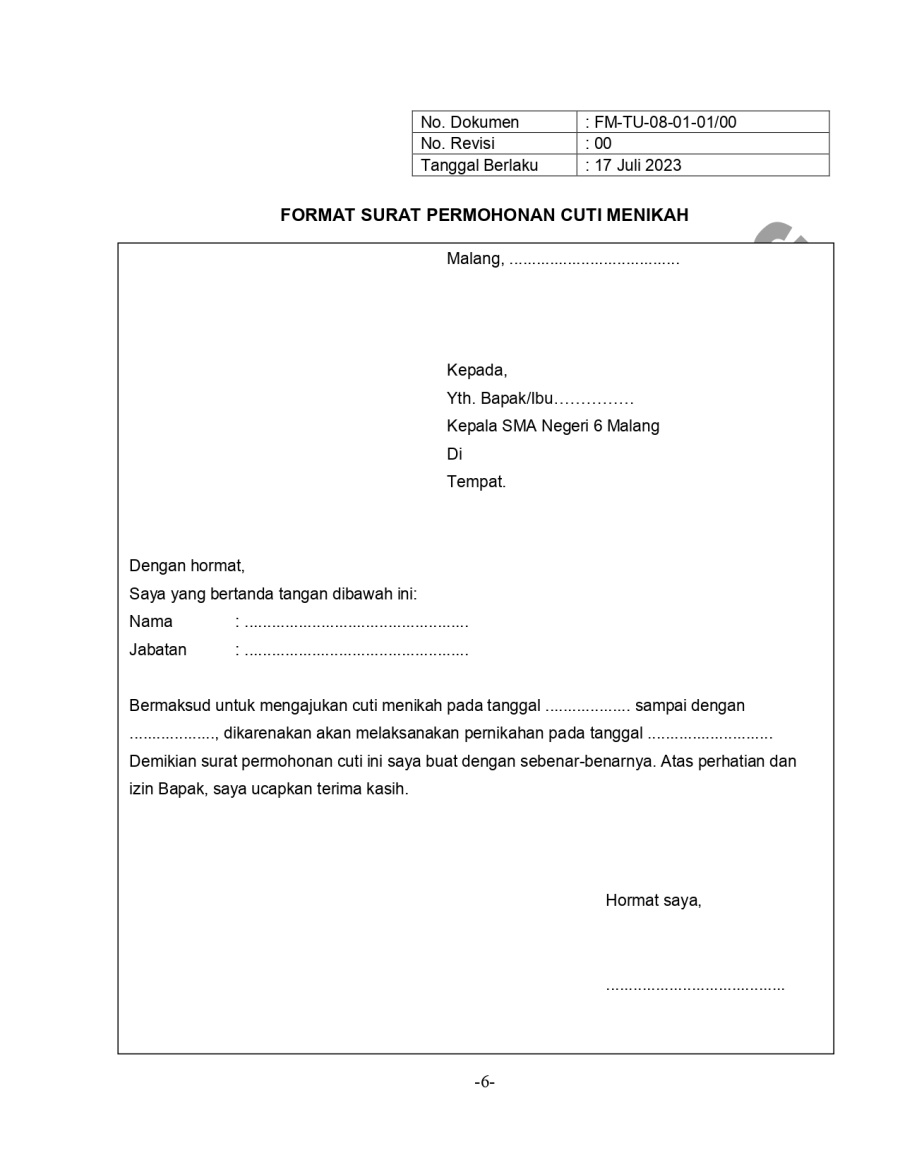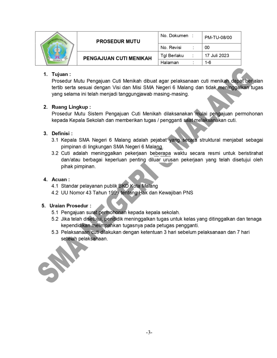 PM. CUTI MENIKAH SMA 6 16 Oktober 20230 Comments1411 PembacaBagikan : Previous postNext post KomentarSearchCategoryBeasiswa ADEM3Info Beasiswa1Informasi16Karir0Kegiatan Peserta Didik2Kewirausahaan2Pengalaman siswa2Pengumuman0Prestasi1Program Sekolah0Sains dan Teknologi0Tips Belajar1Blog Terbaru 19 Mei 2025SELAMAT ULANG TAHUN IBU KHOFIFAH INDAR PARAWANSA 25 Maret 2025PRESTASI PESERTA DIDIK SMA NEGERI 6 KOTA MALANG LOLOS J.. 19 Maret 2025INFORMASI SPMB 2025 13 Maret 2025PESANTREN RAMADHAN SMA NEGERI 6 KOTA MALANG 05 Februari 2025PAMERAN KOLABORASI SENI BUDAYA DAN PKWUPopulerKEGIATAN THE BEE (BOST EMPLOYEE ENGANGEMENT) 16 Desember 2024CERITAKU SEBAGAI SISWA REPATRIASI DI SMA NEGERI 6 MALAN.. 14 Oktober 2023PAMERAN KOLABORASI SENI BUDAYA DAN PKWU 05 Februari 2025Kembali Dibuka! Beasiswa Unggulan Kemdikbud untuk Mahas.. 19 November 2020HEROES #3 PUNCAK ACARA HUT SMA NEGERI 6 MALANG 26 Agustus 2024DownloadPanduan sistem 177.49 KB 22602 DownloadTagsppdbsmariheksa#JAWATIMUR#SMARIHEKSAsman6sman6SMA NEGERI 6 MALANG#SMARIHEKSA