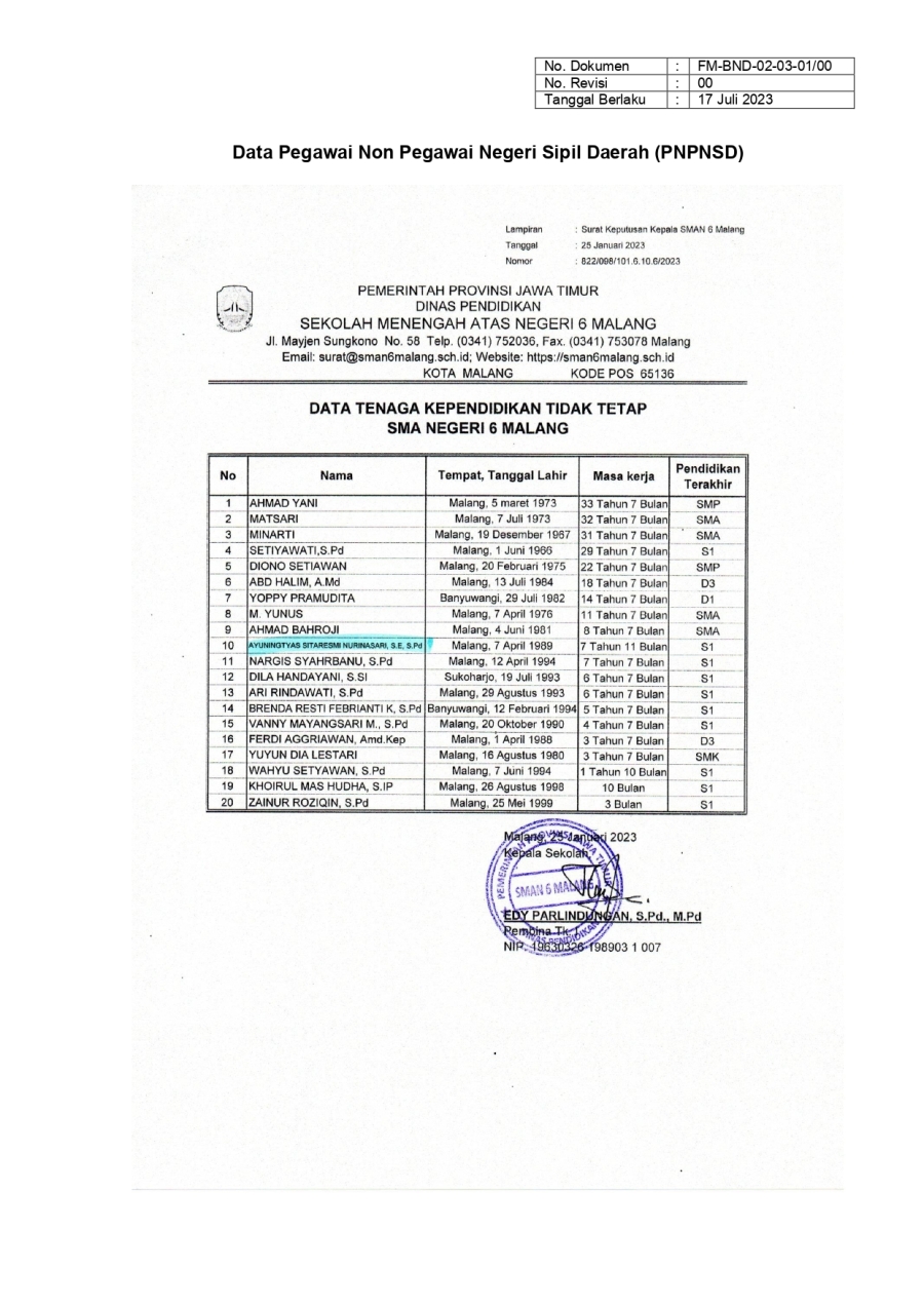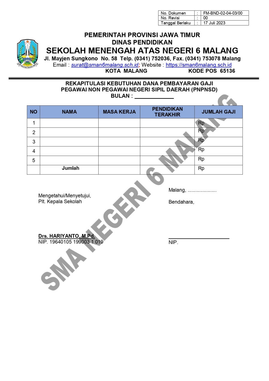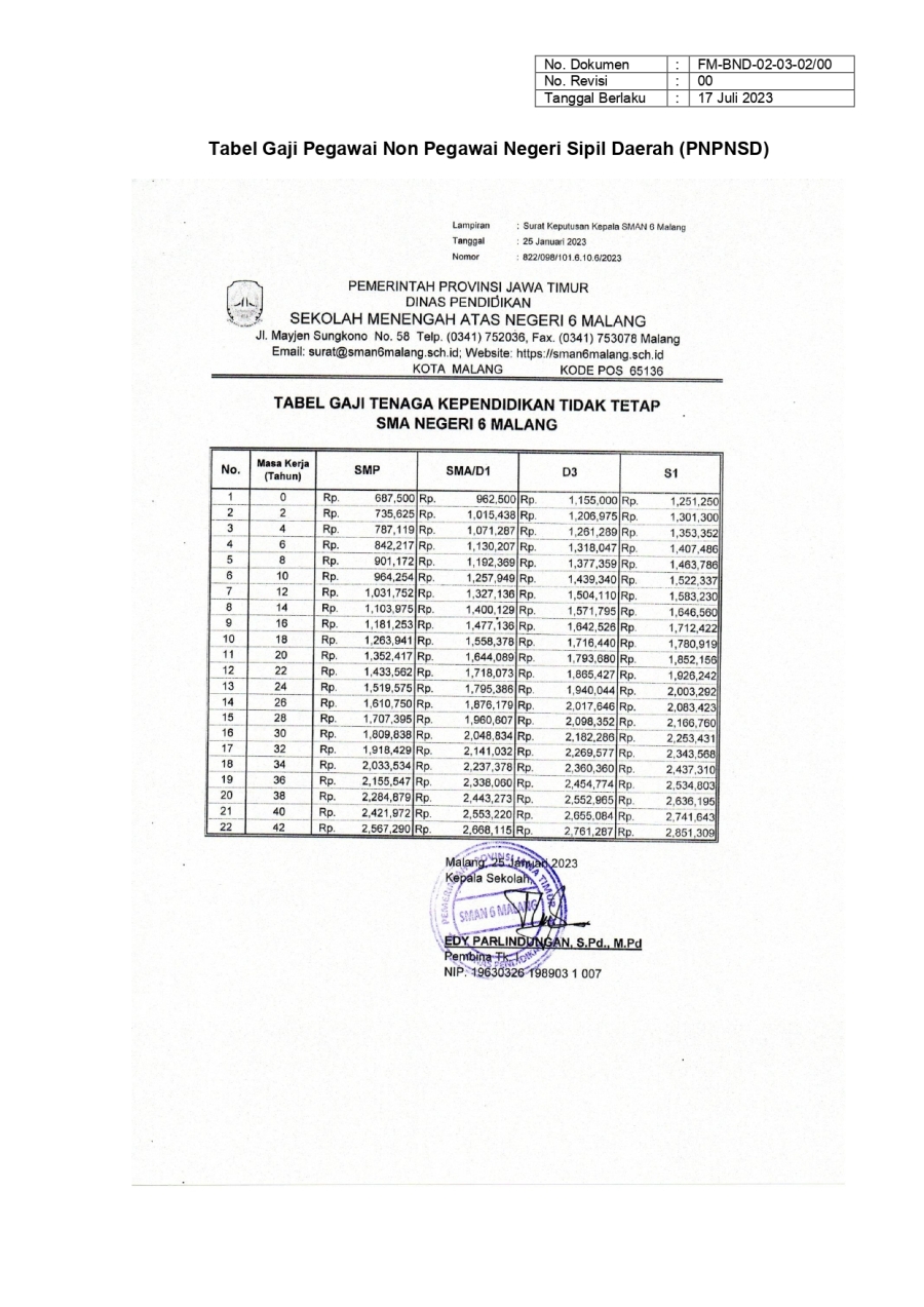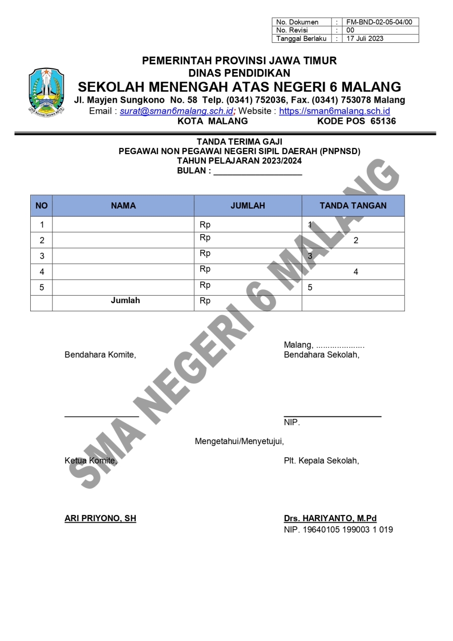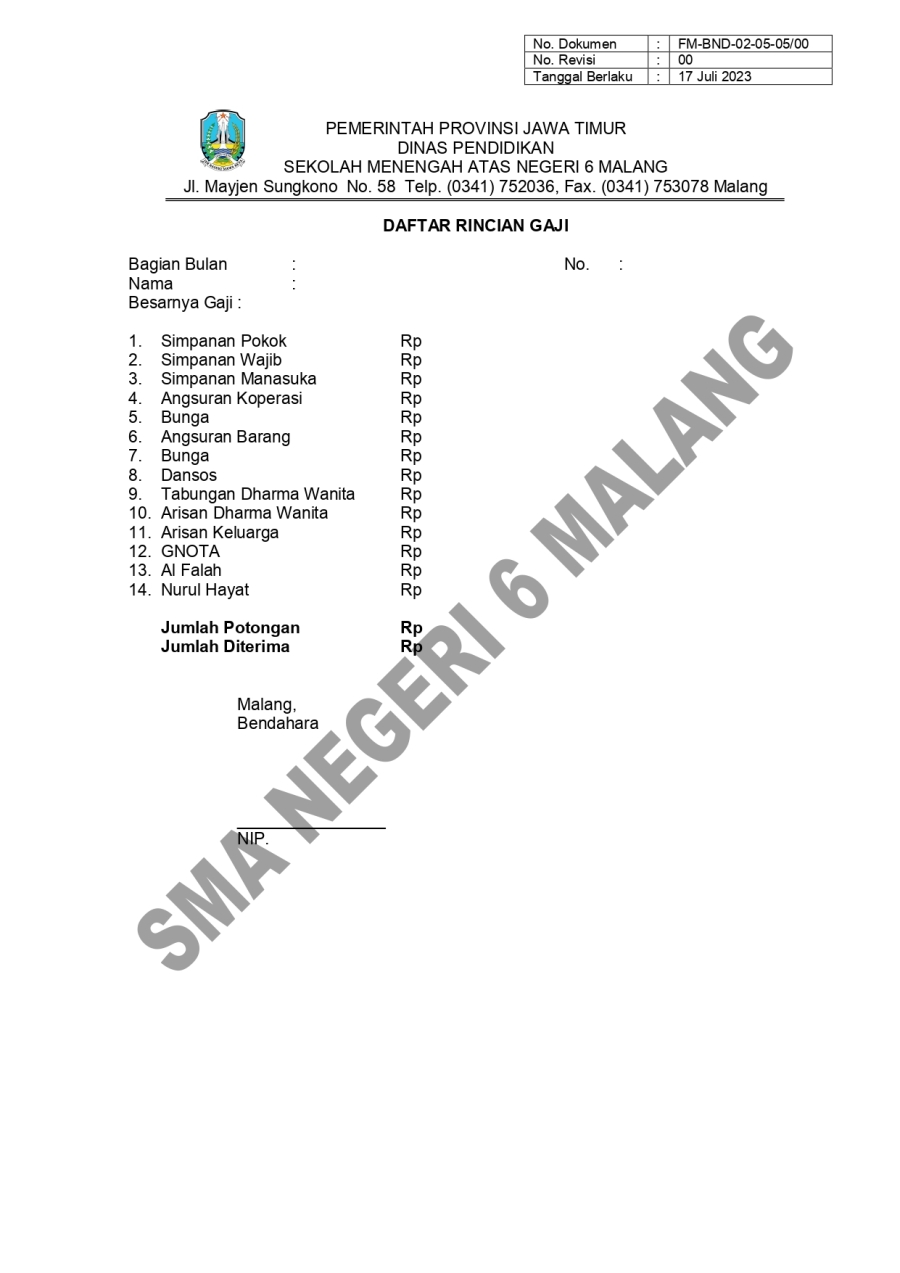 PM. PEMBAYARAN GAJI PNPNSD SMA 6 16 Oktober 20230 Comments1228 PembacaBagikan : Previous postNext post KomentarSearchCategoryBeasiswa ADEM3Info Beasiswa1Informasi16Karir0Kegiatan Peserta Didik2Kewirausahaan2Pengalaman siswa2Pengumuman0Prestasi1Program Sekolah0Sains dan Teknologi0Tips Belajar1Blog Terbaru 19 Mei 2025SELAMAT ULANG TAHUN IBU KHOFIFAH INDAR PARAWANSA 25 Maret 2025PRESTASI PESERTA DIDIK SMA NEGERI 6 KOTA MALANG LOLOS J.. 19 Maret 2025INFORMASI SPMB 2025 13 Maret 2025PESANTREN RAMADHAN SMA NEGERI 6 KOTA MALANG 05 Februari 2025PAMERAN KOLABORASI SENI BUDAYA DAN PKWUPopulerKembali Dibuka! Beasiswa Unggulan Kemdikbud untuk Mahas.. 19 November 2020PESANTREN RAMADHAN SMA NEGERI 6 KOTA MALANG 13 Maret 2025INFORMASI SPMB 2025 19 Maret 2025PENGALAMANKU SEBAGAI KETUA OSIS 2022/2023 SMA NEGERI 6 .. 23 November 2023SMARIHEKSA TEBAR PRESTASI 22 Januari 2024DownloadPanduan sistem 177.49 KB 22610 DownloadTagsprogramSMA NEGERI 6 MALANGvidyagatasman6#SMARIHEKSA#sainssiswa baruKarir