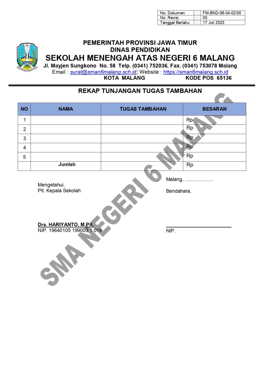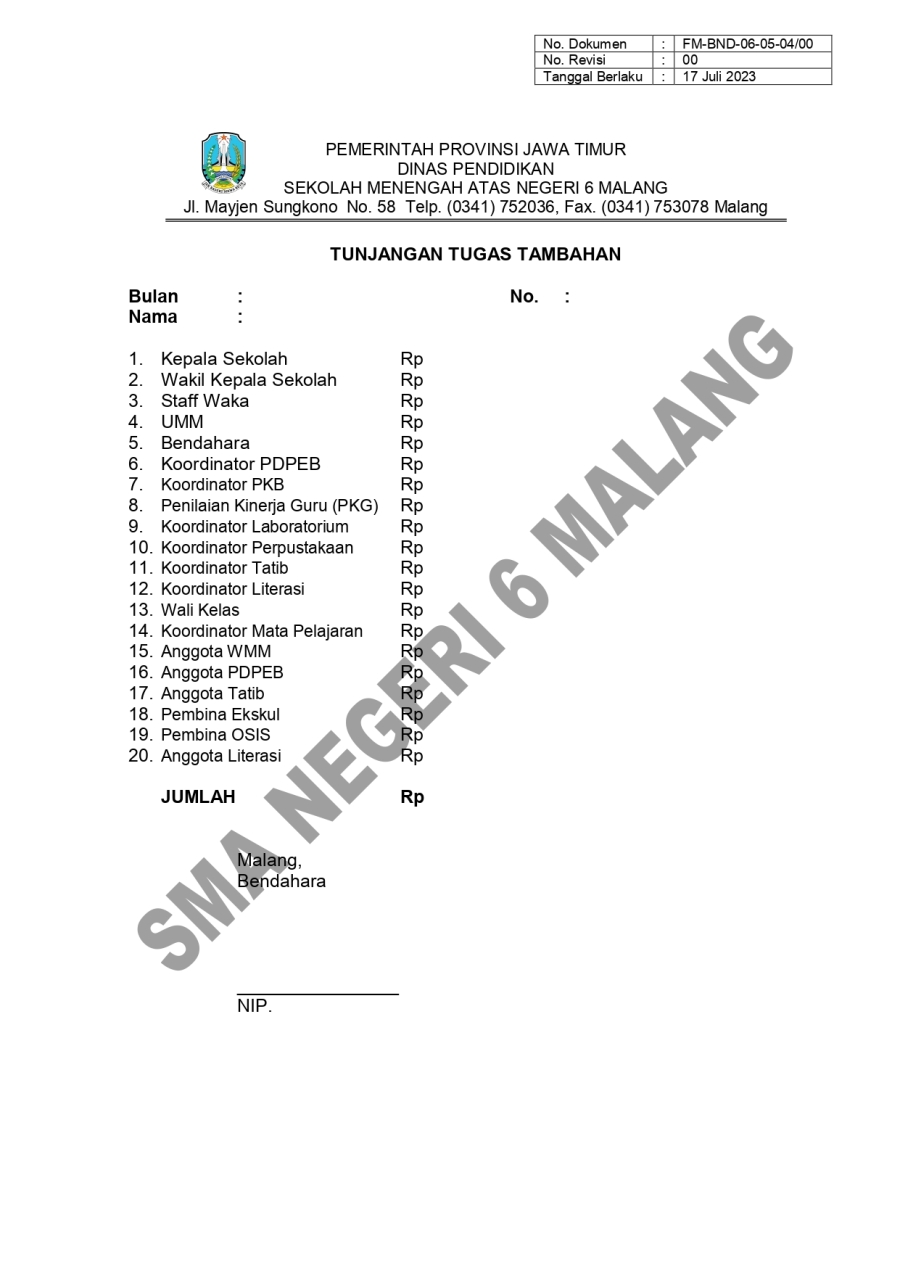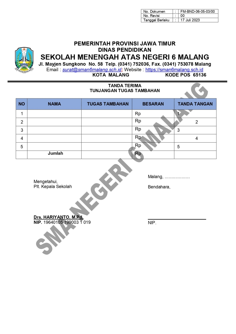 PM. PEMBAYARAN TUNJANGAN TUGAS TAMBAHAN SMA 6 16 Oktober 20230 Comments1589 PembacaBagikan : Previous postNext post KomentarSearchCategoryBeasiswa ADEM3Info Beasiswa1Informasi16Karir0Kegiatan Peserta Didik2Kewirausahaan2Pengalaman siswa2Pengumuman0Prestasi1Program Sekolah0Sains dan Teknologi0Tips Belajar1Blog Terbaru 19 Mei 2025SELAMAT ULANG TAHUN IBU KHOFIFAH INDAR PARAWANSA 25 Maret 2025PRESTASI PESERTA DIDIK SMA NEGERI 6 KOTA MALANG LOLOS J.. 19 Maret 2025INFORMASI SPMB 2025 13 Maret 2025PESANTREN RAMADHAN SMA NEGERI 6 KOTA MALANG 05 Februari 2025PAMERAN KOLABORASI SENI BUDAYA DAN PKWUPopulerNATIONAL APPLIED SCIENCE PROJECT OLYMPIAD 17 Oktober 2023PRESTASI PESERTA DIDIK SMA NEGERI 6 KOTA MALANG LOLOS J.. 25 Maret 2025MEMAKNAI PERINGATAN HARI KARTINI 2024 22 April 2024Jurusan Sastra Indonesia: Materi Kuliah dan Peluang Ker.. 19 November 2020Kembali Dibuka! Beasiswa Unggulan Kemdikbud untuk Mahas.. 19 November 2020DownloadPanduan sistem 177.49 KB 22621 DownloadTags#SMARIHEKSARIsiswa baruKarirSMA NEGERI 6 MALANGsman6hutke78sman6