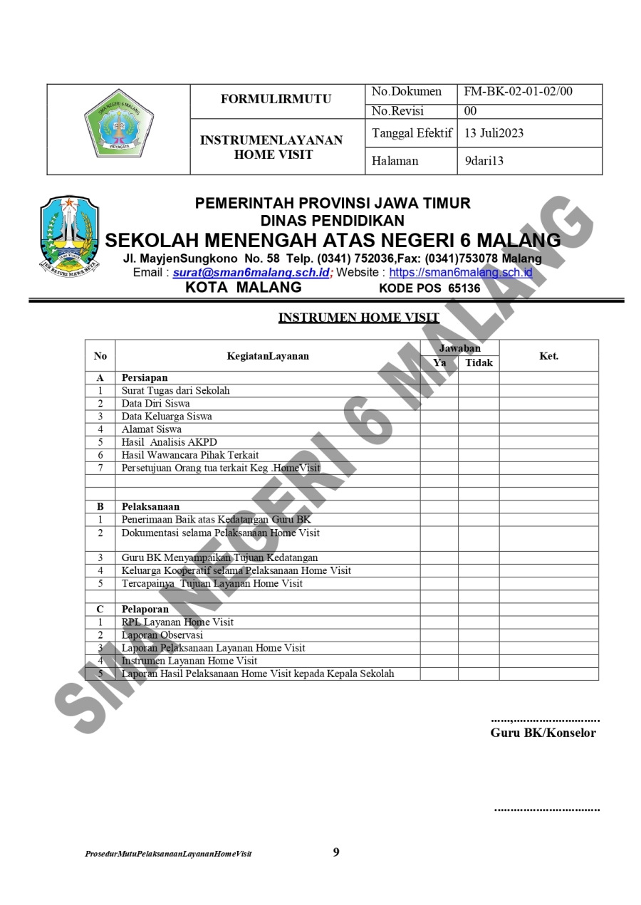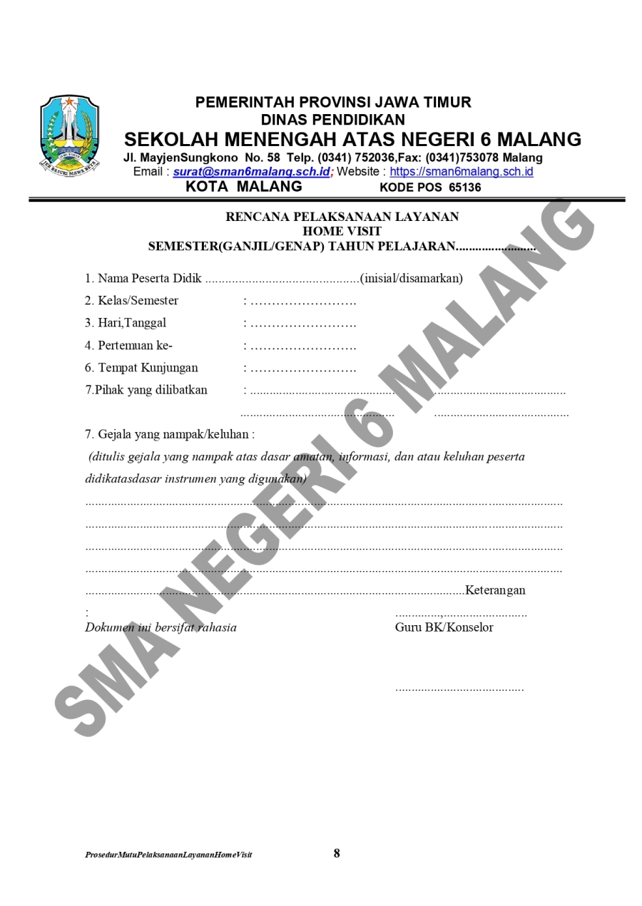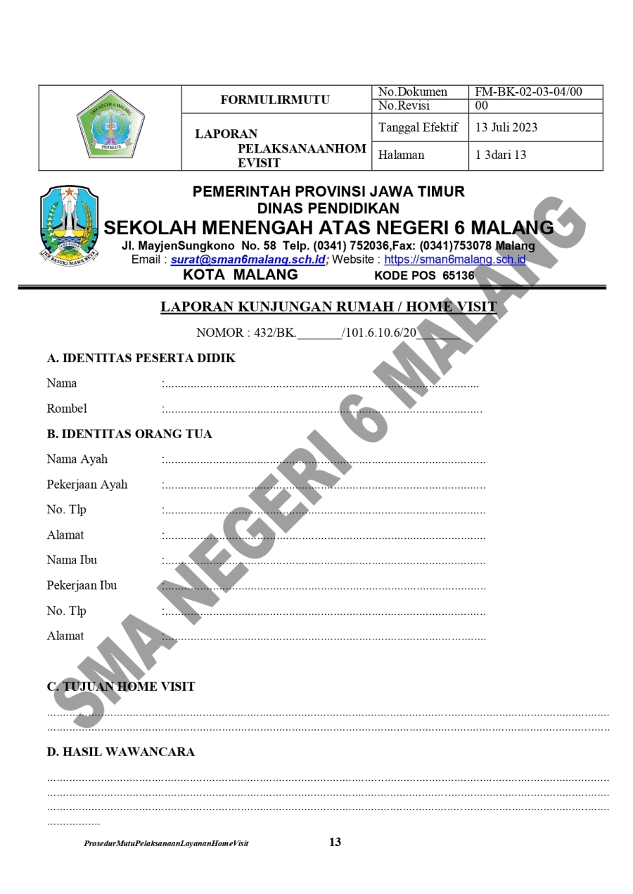 PM. LAYANAN HOME VISIT SMA 6 16 Oktober 20230 Comments1404 PembacaBagikan : Previous postNext post KomentarSearchCategoryBeasiswa ADEM3Info Beasiswa1Informasi16Karir0Kegiatan Peserta Didik2Kewirausahaan2Pengalaman siswa2Pengumuman0Prestasi1Program Sekolah0Sains dan Teknologi0Tips Belajar1Blog Terbaru 19 Mei 2025SELAMAT ULANG TAHUN IBU KHOFIFAH INDAR PARAWANSA 25 Maret 2025PRESTASI PESERTA DIDIK SMA NEGERI 6 KOTA MALANG LOLOS J.. 19 Maret 2025INFORMASI SPMB 2025 13 Maret 2025PESANTREN RAMADHAN SMA NEGERI 6 KOTA MALANG 05 Februari 2025PAMERAN KOLABORASI SENI BUDAYA DAN PKWUPopulerPENGALAMANKU SEBAGAI KETUA OSIS 2022/2023 SMA NEGERI 6 .. 23 November 2023Kembali Dibuka! Beasiswa Unggulan Kemdikbud untuk Mahas.. 19 November 2020PENGALAMANKU SEBAGAI KETUA MPK 2022/2023 SMA NEGERI 6 M.. 25 Oktober 2023NATIONAL APPLIED SCIENCE PROJECT OLYMPIAD 17 Oktober 2023SELAMAT ULANG TAHUN IBU KHOFIFAH INDAR PARAWANSA 19 Mei 2025DownloadPanduan sistem 177.49 KB 22635 DownloadTagsppdb#JAWATIMURSMA NEGERI 6 MALANGsiswa barubeasiswaInformasisekolah#GUBENUR
